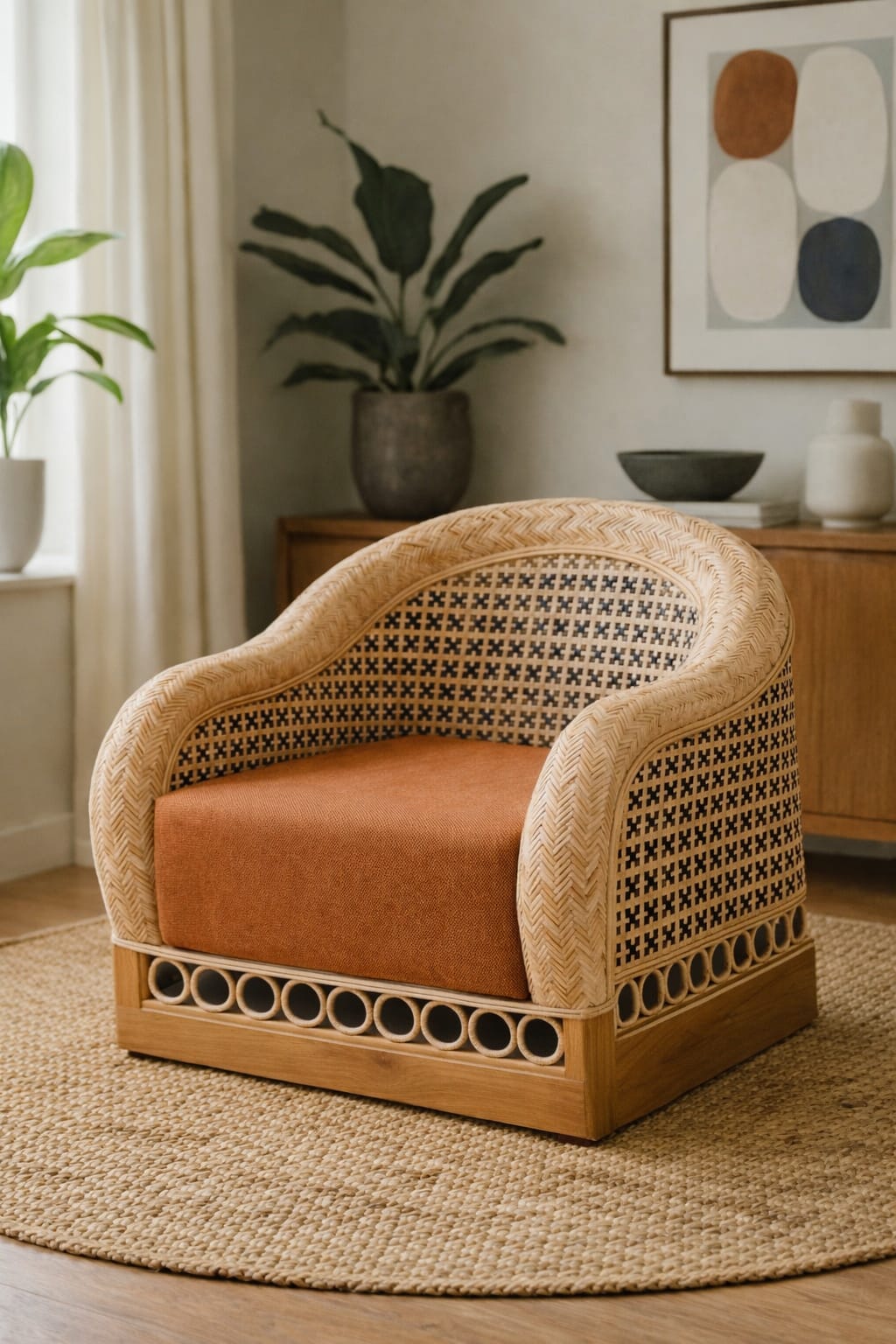 The plush terracotta toned seat cushion offers a warm contrast to the natural materials while providing exceptional comfort. Styled with a light natural fiber rug, lush greenery, and soft natural lighting, the chair enhances the space with an airy, calm, and resort-inspired atmosphere.