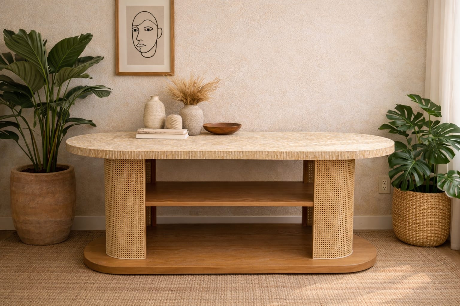 This coffee table pairs beautifully with tropical modern, coastal, and contemporary natural interiors, serving as both a functional surface and a striking centerpiece for drinks, books, and decorative accents.