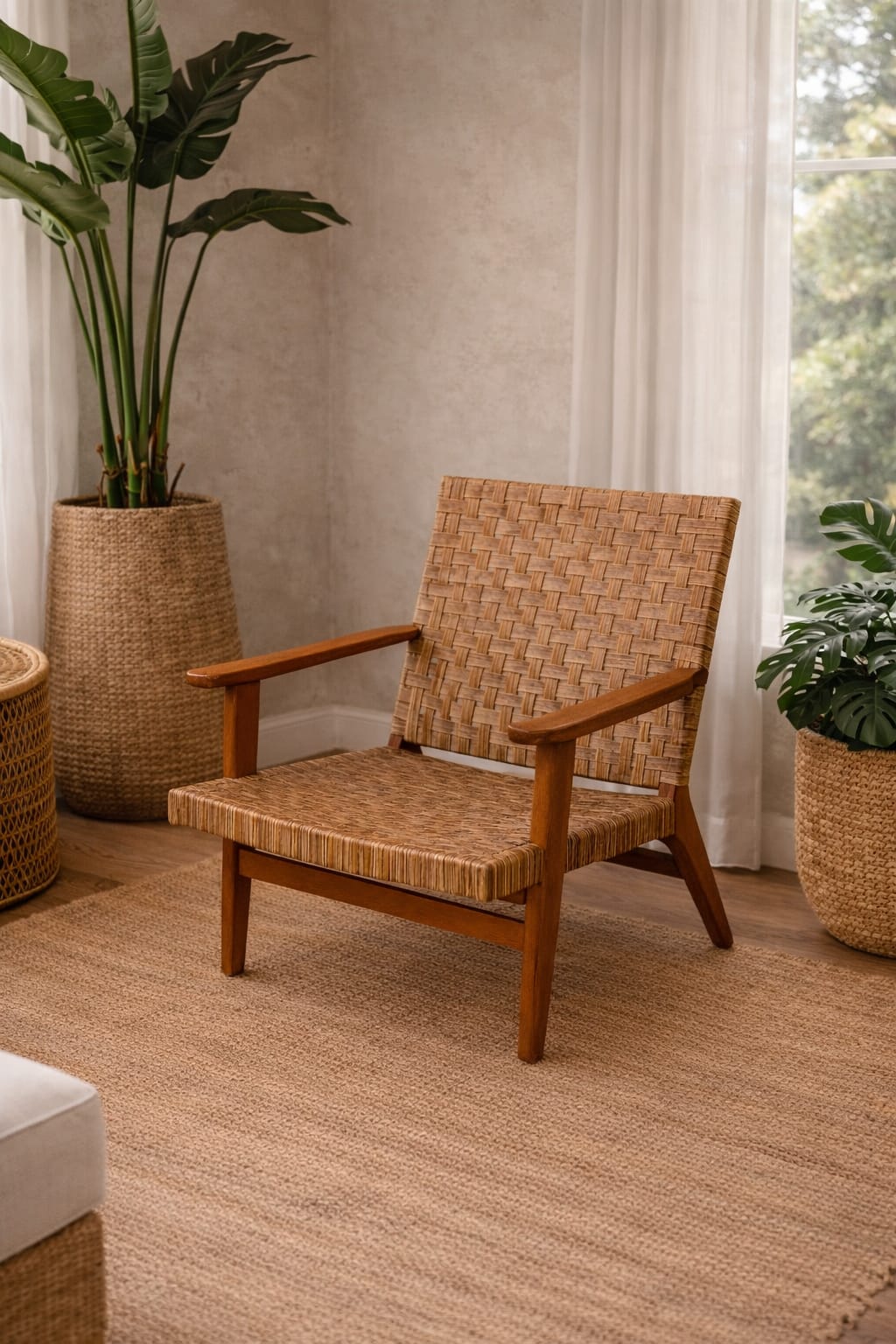Placed in the corner near the wall and window, the chair forms a functional and cozy seating nook without disrupting the room’s layout. Natural daylight enhances the wood grain and woven textures, adding brightness and a calming atmosphere to the space.