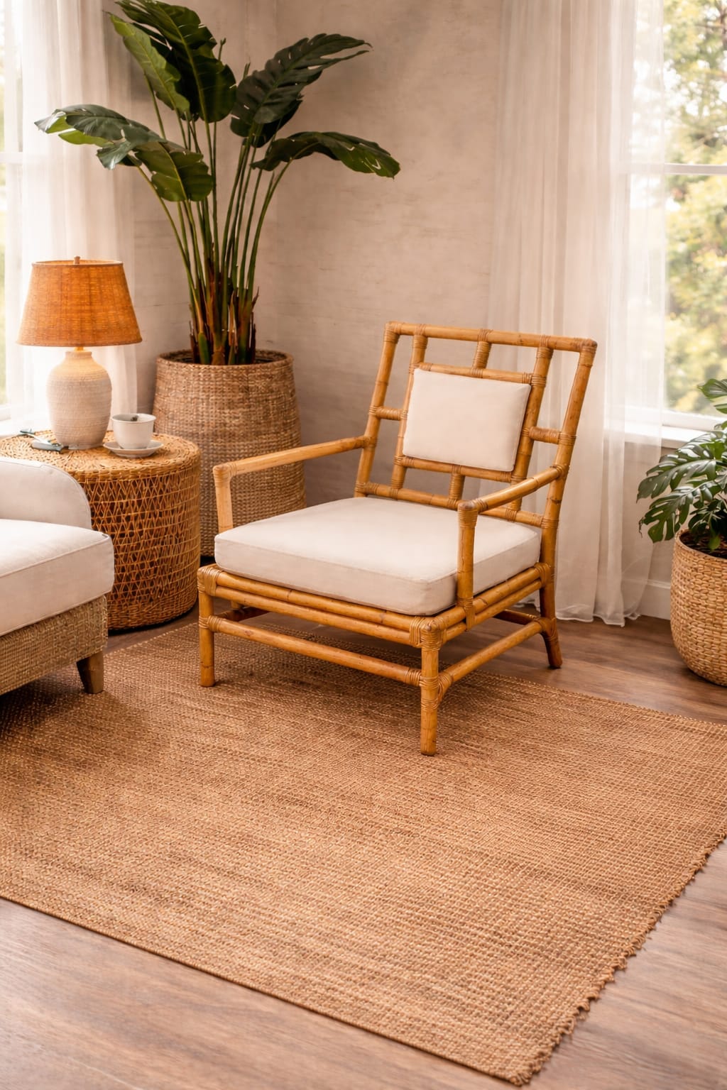 Equipped with neutral toned seat and back cushions, the chair provides comfortable support without compromising its natural aesthetic. Positioned near the wall and aligned with other seating, it creates a realistic and functional layout suitable for shared seating areas or relaxed corners.