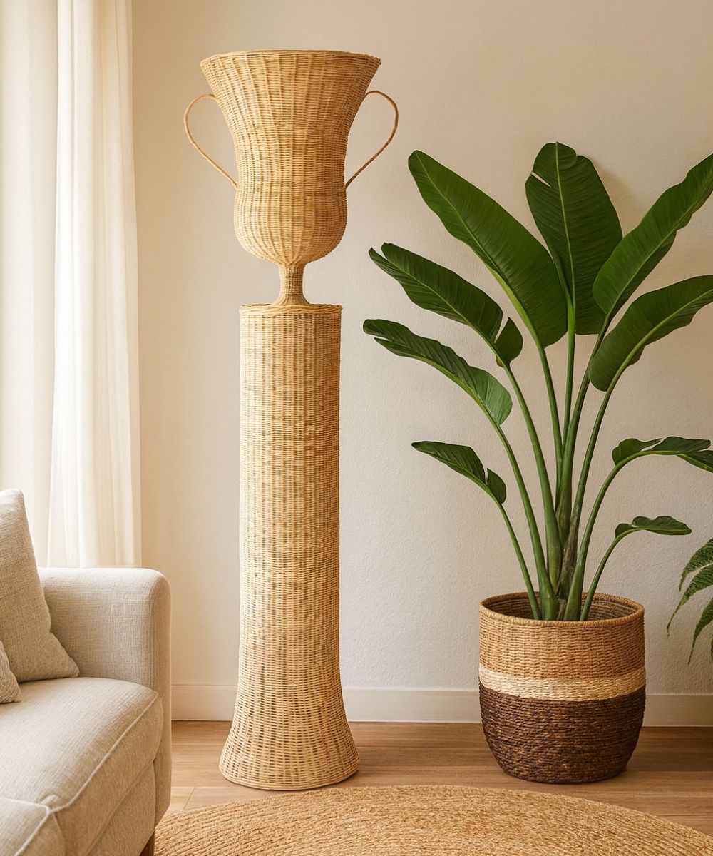 A tall decorative vase made of natural rattan with neat handwoven details. Its elegant trophy-like shape makes it perfect as a statement piece for living rooms, hotel lobbies, or semi-outdoor spaces.